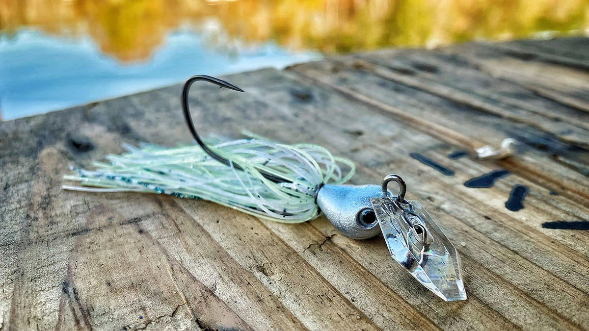 With its hand-tied silicone skirt and a very pronounced “chattering” sound thanks the channeled groove along the bottom of the head, it’s my favorite choice for this kind of shallow-water skipping. The skirt stays intact after days and weeks of abuse and the prominent double-wire bait keeper keeps those soft-plastic trailers in place at all times.