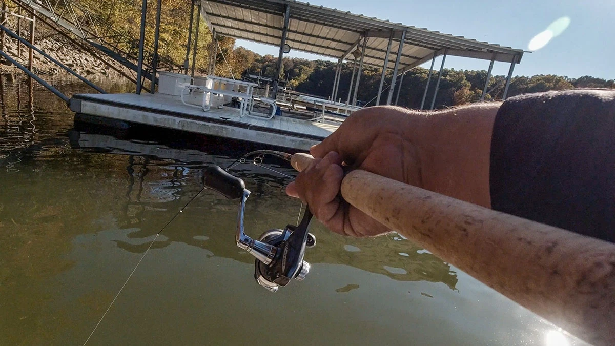 Originally, I wanted a short 6-foot rod for shooting docks. And bar none, it’s my favorite. Specifically the B’n’M Sharp Shooter (review) is my favorite for shooting docks. Put 4-pound line and a 1/16-ounce jig on that setup and you can shoot a jig to the back of the dock. But the short rod will do so much more than just get you underneath boats and dock walkways. When you’re fishing a piece of visible cover and you want to stay back and shoot into the cover, the short rod and the shooting cast is way better than trying to a whip a jig into the cover with an over hand cast. I will shoot at visible stake beds, laydowns, cracks in bluff banks, between weeds, and more.
