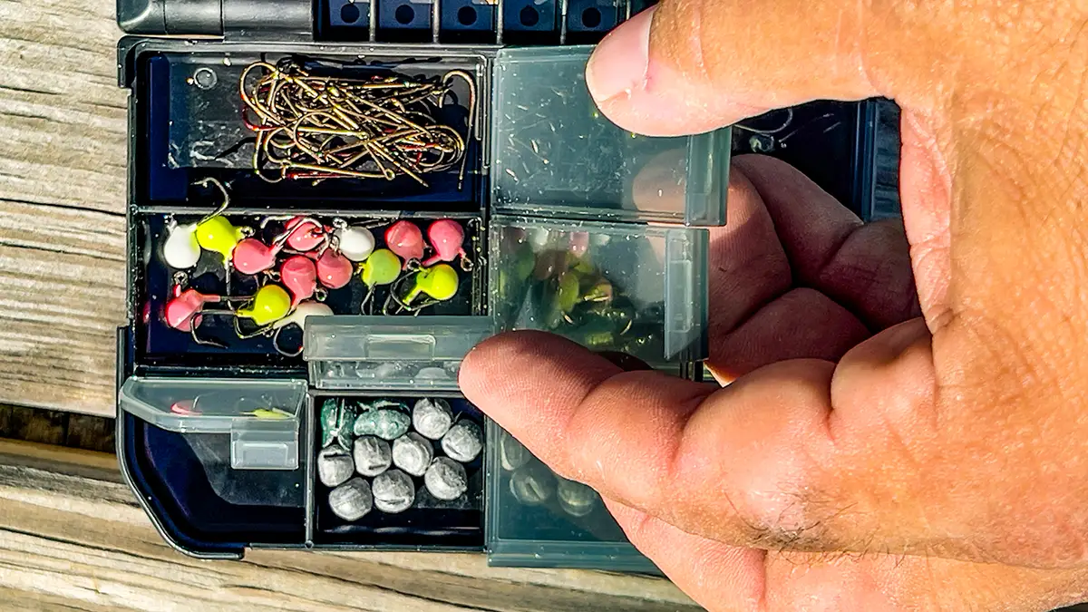 In my jig box I carry an assortment of terminal tackle and jigs for bluegills for both artificial fishing and live bait fishing. The jig box includes the following: