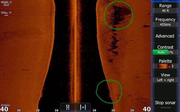 Since contrast needs to be adjusted depending on the color palette, it stands to reason certain things on the bottom tend to show up better in certain palettes. Rocks show up well on the darker palettes while wood shows up better on your fish finder’s lighter palettes.