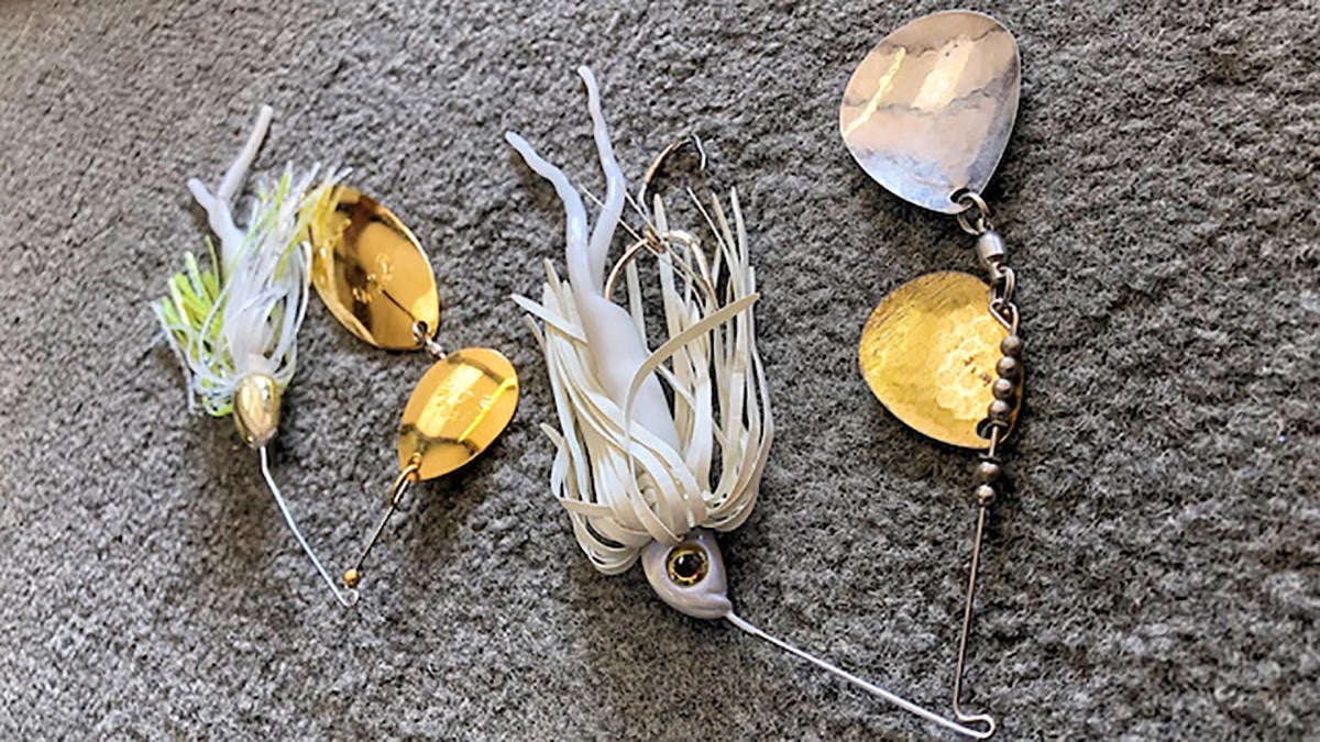 So what do these spinnerbaits look like? Well for years and years, we primarily fished this way with a white 3/8-ounce spinnerbait with double Colorado blades-sizes 4 and 6. And that’s still what we use in muddy to really muddy water.