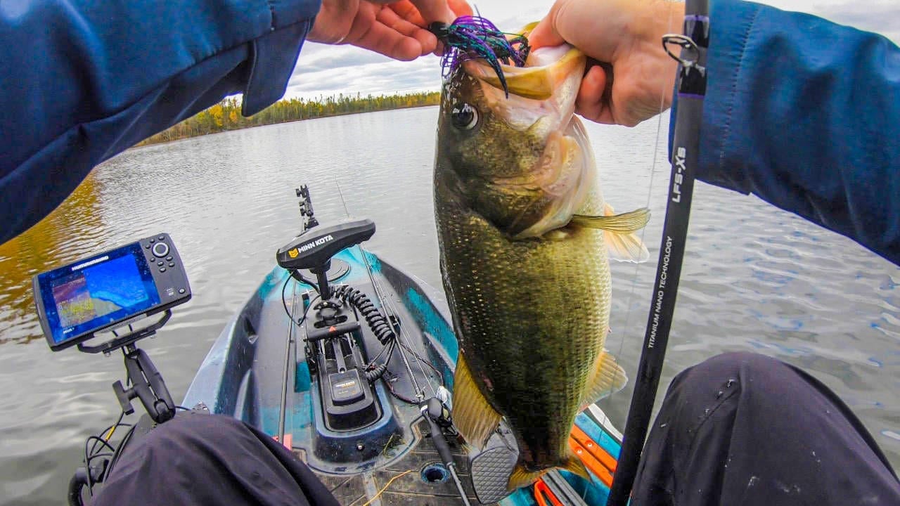 In bass fishing, the prespawn is analogous to the rut, but the mid- to late fall can be as good or better for numbers of trophy bass. Wired2Fish’s McKeon “Keys” Roberts demonstrates this by sliding his fishing kayak into a known “small lake” and catching several big bass out of an isolated grass bed on spinnerbaits and jigs.
