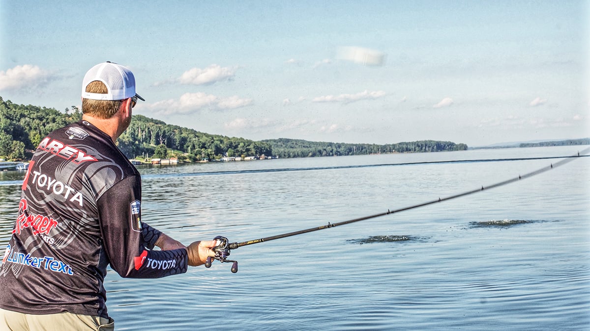 Arey throws this presentation on a 7-foot, medium-action Lew’s Custom Pro rod and a Lew’s Hyper Mag reel. He tailors his line size and hook configuration based on the pattern but prefers 15-pound P-Line Tactical Fluorocarbon and a 4/0 wide-gap hook that he Texas rigs weedless when fishing around vegetation.