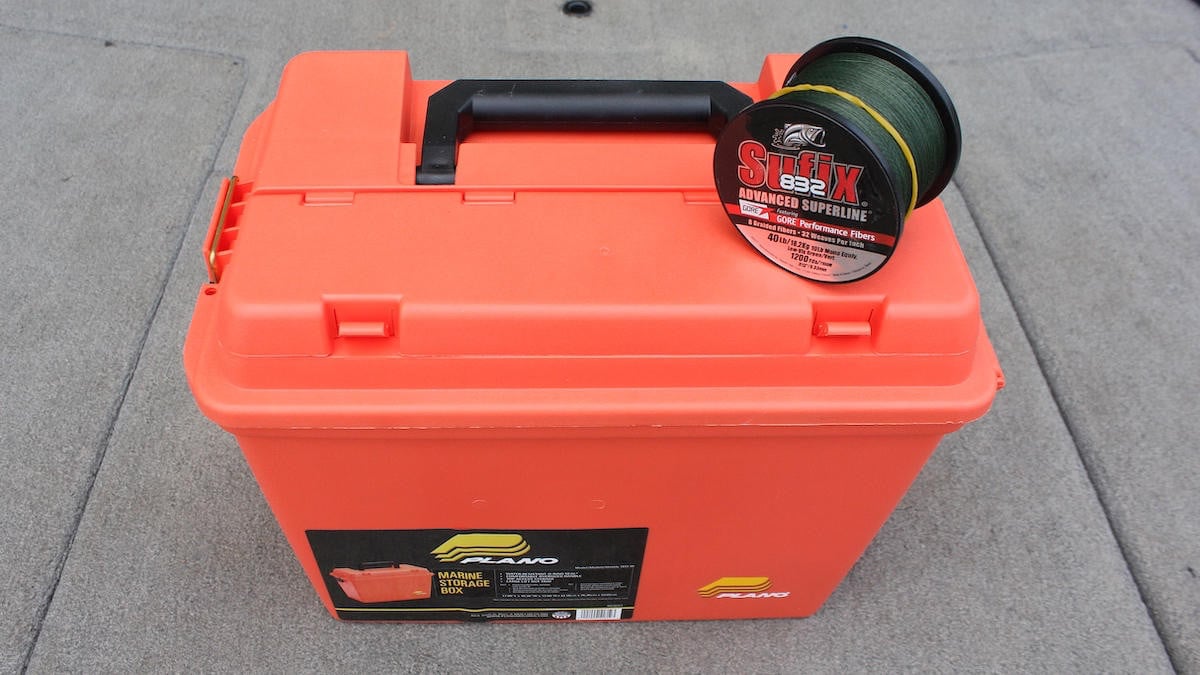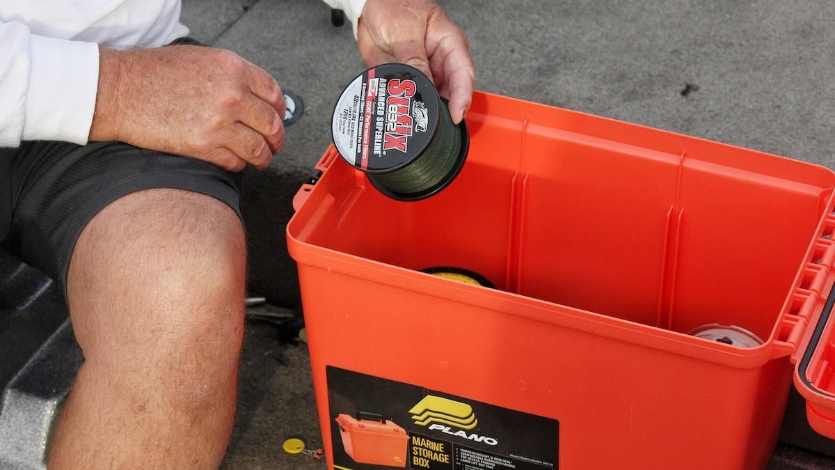 I prefer a fairly large waterproof box like the Plano XL Dry Storage 1812 for storing bulk spools of line. It’s big enough to hold a lot of line and is easy to take in and out of the boat which is nice if you’re staying at a hotel and need to re-spool or just want to make sure no one walks off with it.