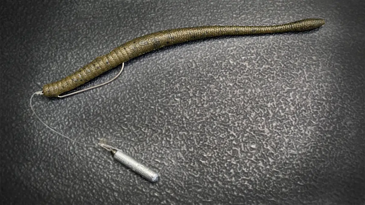 A Neko rig looks a lot like a Wacky rig at first glance, but these two differ in a couple key ways. For starters, the orientation of the hook point is different. Instead of running the hook perpendicular to the worm like you would a with a Wacky rig, you want to rig the hook in-line with the worm, with the hook point facing up. “Up” is determined by which end of the worm you intend to add a weight to—which is the “down” end and the second key difference.