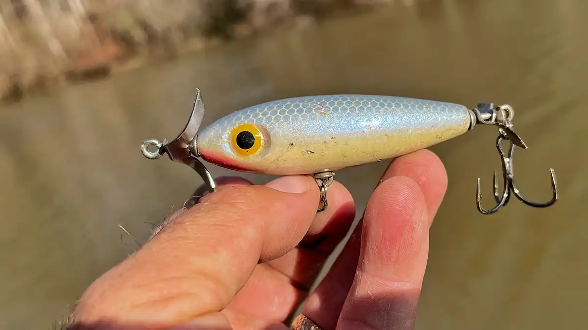 But there’s one particular drawback to braid with this type of bait— it tangles in the front prop. These baits are designed to be twitched along the surface. The props spin as the bait coasts forward after each twitch, the front prop often tangling in the limp braid as it spins. You can use a short, 6-inch mono leader though to prevent this. The stiffer (but still buoyant) mono stays out in front of the prop (while also still keeping the nose of the bait up).