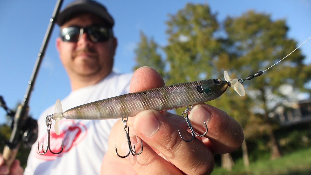 A lot of anglers prefer to throw prop-style topwaters on braided line in order to increase the distance they can throw the bait. The braid also comes in handy when battling big bass that try to bury up in dense vegetation. But the drawback of the limp braid is that it gets tangled up in the front prop of a bait like this between twitches. Then the bait has to be retrieved in order to untangle the line from the prop.