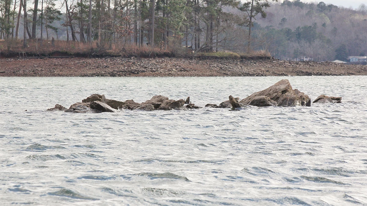 Boulders, jetties and points are some of the most common current breakers. There are two reasons the bass tuck in behind these obstructions: They can conserve energy and food gets delivered right to them. If it’s hard for a bass to hold its ground in the current, it’s exponentially harder for baitfish, crawfish and other forage to do the same.