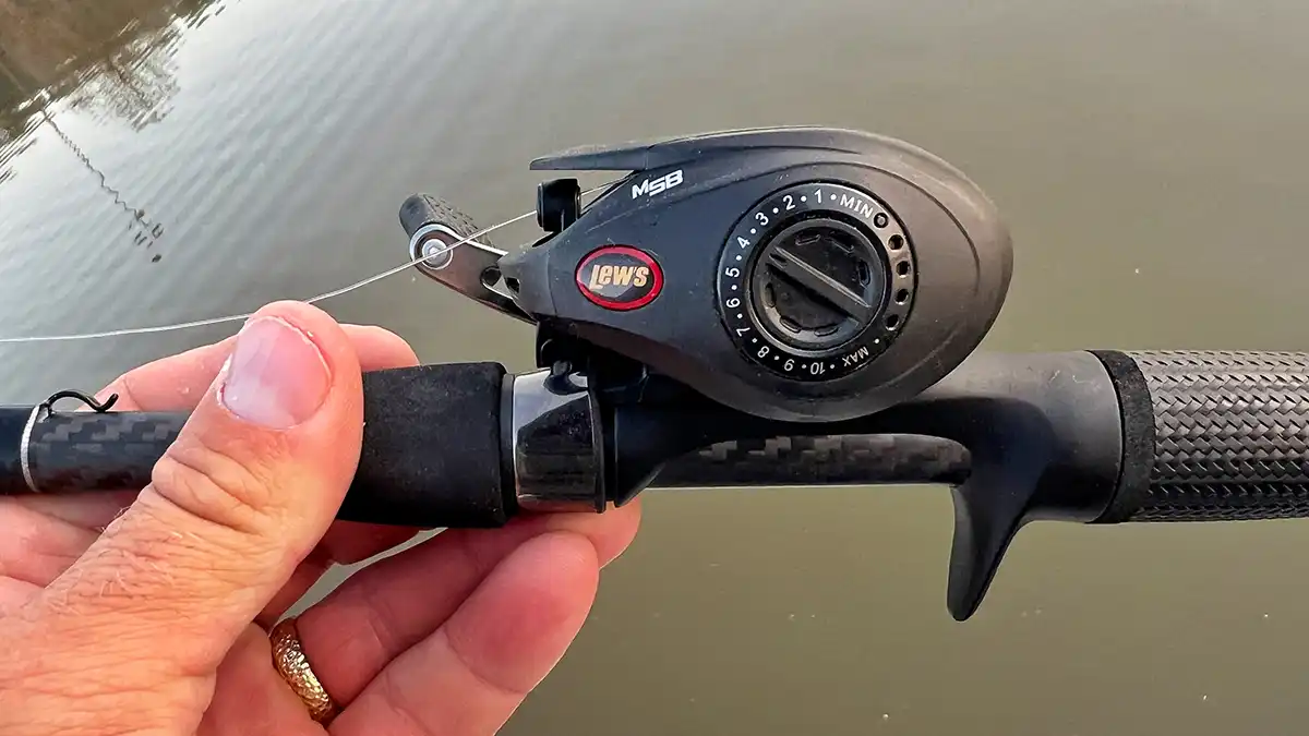 Reels with external controls, however, like the Lew’s LFS Speed Spool, are much easier for anglers to pick up and adjust. These reels have a dial on the side plate opposite the handle that usually has some clear indication on it for which way the dial needs to be turned to increase or decrease the brake. Some simply say “min” and “max”. Others may have a scale of 1 through 10. See this story for more information on how to set a baitcaster.