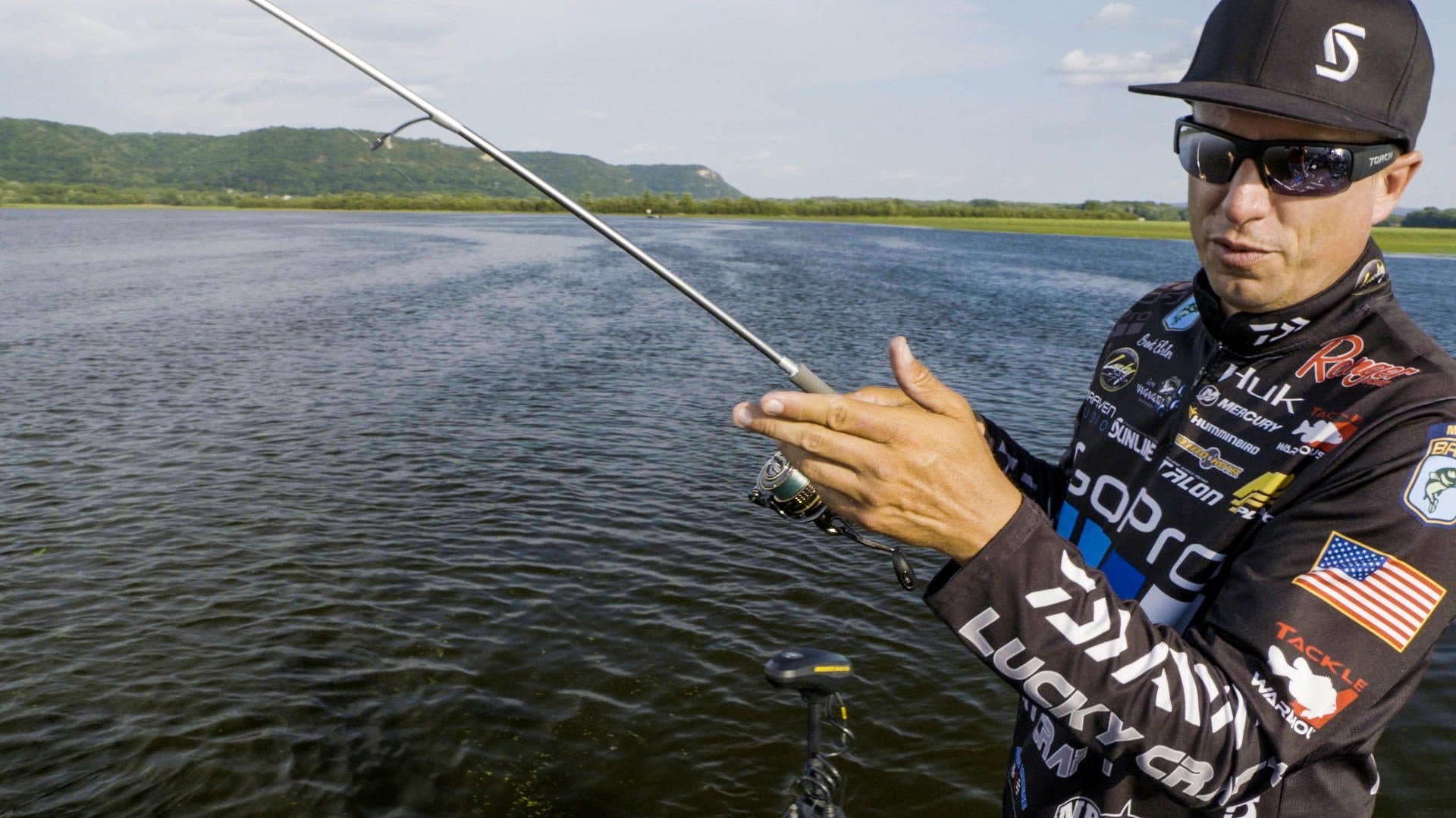 Whether fishing docks with a light-line setup in clear water or using a bubba shot rig with casting gear around grass and wood, the drop shot is more versatile than anglers give it credit. Ehrler spotted bass blowing up on shad on the top of an expansive grass flat on this day. In addition to bass denying his topwater, grassy debris made it difficult to work a trebled lure. His shad-imitating drop shot plastic fished clean through the grass while closely imitating the forage.