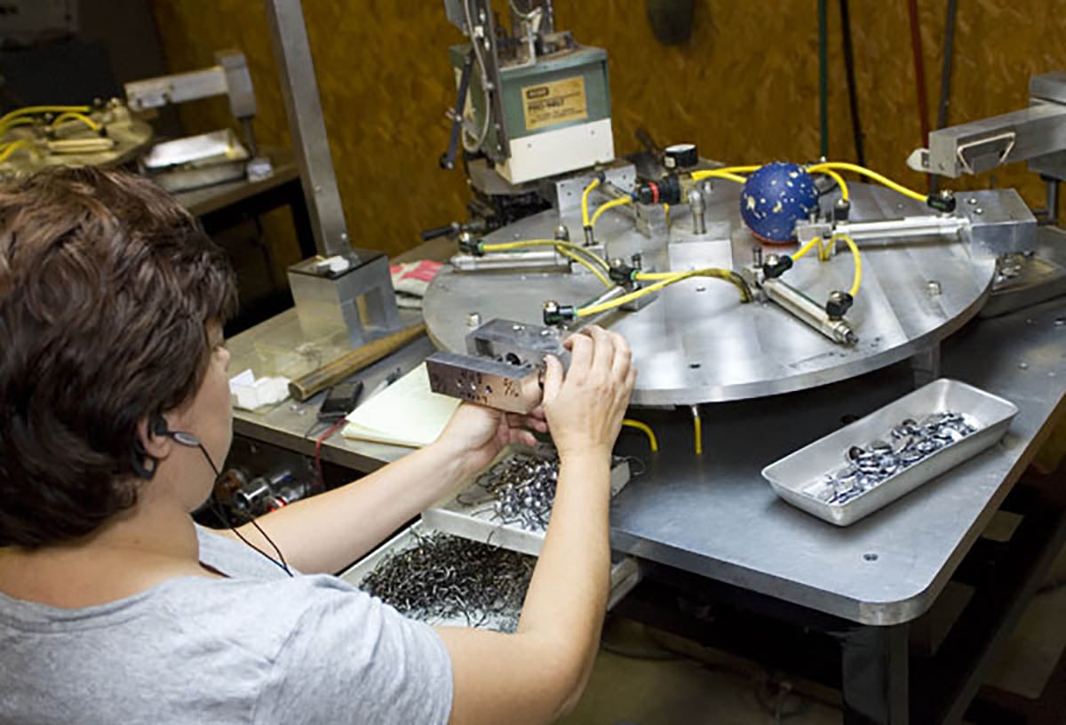 We were visiting Jewel Bait Company and KG Enterprise who pours their leadheads in Northern Arkansas. KG not only pours Jewel’s baits, but they are makers of 18-20 top brands’ jigheads, spinnerbaits, and other lures. The unassuming building looks like any other machine shop from the outside, but inside was something totally different. A very quaint setting with simple offices in the front. Desks armed with CAD drawing computers and loosely dressed with jigheads, drawings and orders for new product on the worksurfaces. As you entered the shop floor, it was something else. From a distance it didn’t seem like much, mostly because we weren’t exactly sure what we saw.