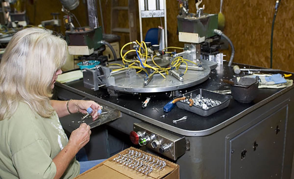 A custom round table top separates the worker from the pot. On one end the worker is putting a hook and usually a pin or clip into a mold. The press a button with their foot and the mold closes and the table spins the mold under the lead pot and pours the right amount of led into the mold. As that happens the mold that was just under the pot spins to the worker and they quickly remove the lure from the mold and replace with a hook. Then the process repeats. Sometimes as much as 2,000 spinnerbaits at a single station in a single day.