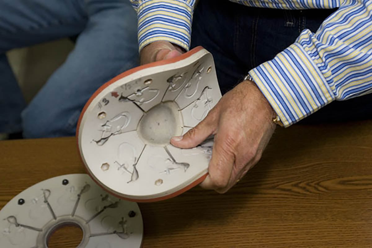 “Then we can decide where we place the cut out in the mold so that there is no additional sprue, the excess lead on a jig from pouring. If we pour it flush, we can use a mechanical slicer so that all the worker has to do is take the jig out of the mold and it’s done. No polishing or cutting sprue. We polish all the molds to begin with so every pour is perfect.”
