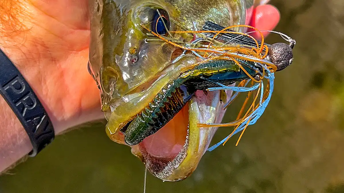 Some of those better bites overpowered the traditional Bitsy Bug’s light-wire hook from time to time. That was admittedly my fault for using gear that was too heavy for it, as I tried to fish the jig back in denser cover. So I’d swap over to the Bitsy Flip sometimes, with its bolder and stronger hook. That did the job well in the thicker cover, but was a bit much when I’d swap back over to stretches with bare bank and smaller rock.