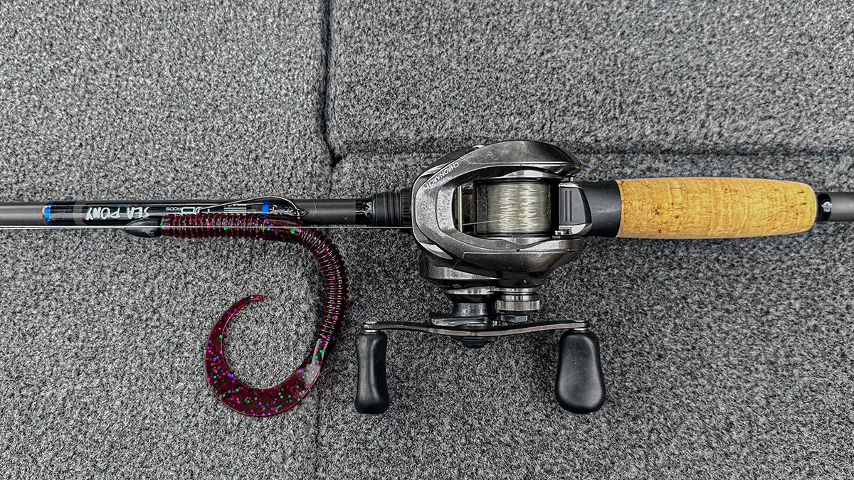 When throwing a larger sized worm such as the Yamamoto Ichi Worm, it is important to have the right setup. This will lead to a higher hookup percentage and save you from some serious heartbreak. When fishing this bait offshore around cover, I like to use a long heavy rod with a high gear ratio reel. A great option for an offshore worm rod is the JB3 Sea Pony. This is a 7-foot, 7-inch rod that gives you plenty of leverage and power over fish, while still maintaining enough bend to deliver an adequate hook set.
