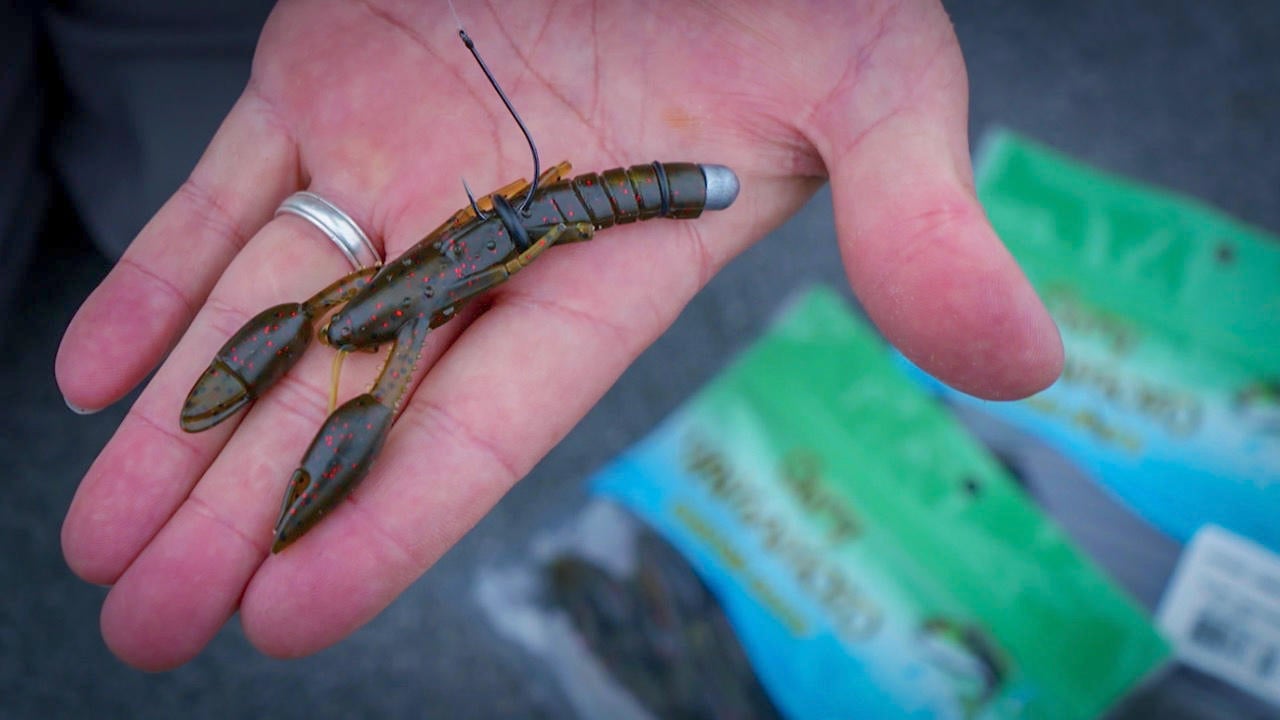 Although most creature/crawfish plastics will work, DeChaine discusses why he prefers mid-sized to smaller baits with floating craws such as the Yamamoto PsychoDad. A medium power spinning rod paired with a braided mainline and fluorocarbon leader get the nod for casting ability, sensitivity and power for handling fish around grass.