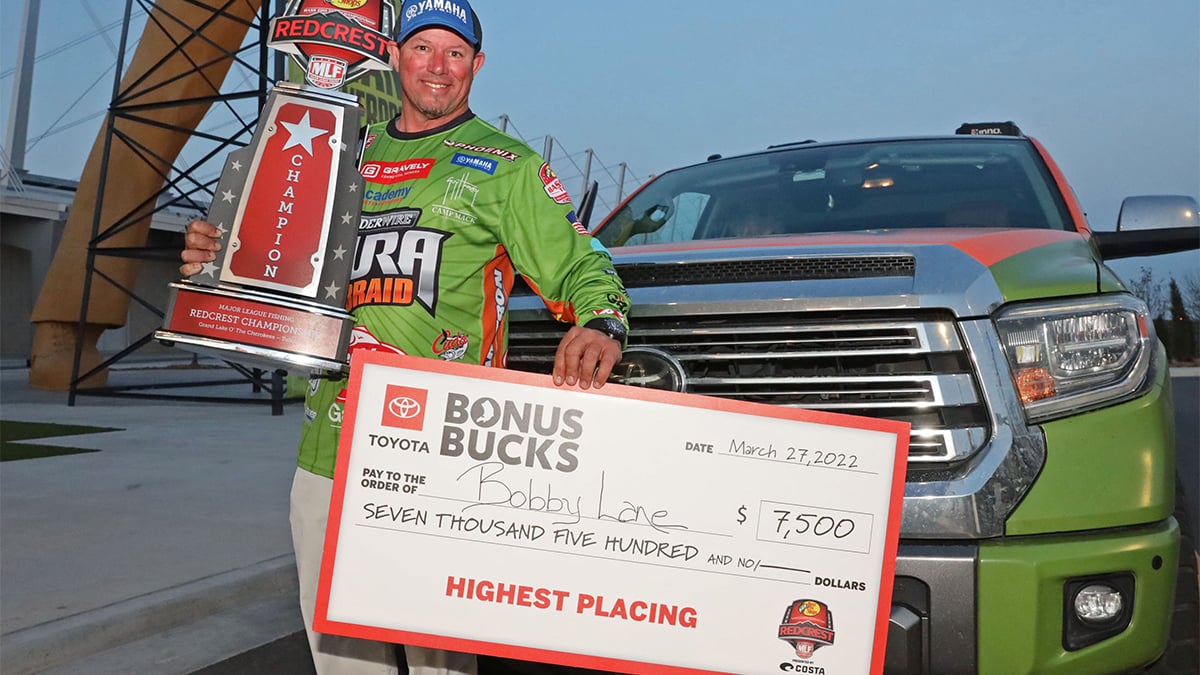 “I can still remember the very first Toyota Bonus Bucks check I won. It was from an Elite Series event on Smith Mountain Lake about a dozen years ago. I finished around 20th place, and still won a Bonus Bucks check. I told my wife how awesome it was that I didn’t have to win the tournament to win the Bonus Bucks,” says Lane.