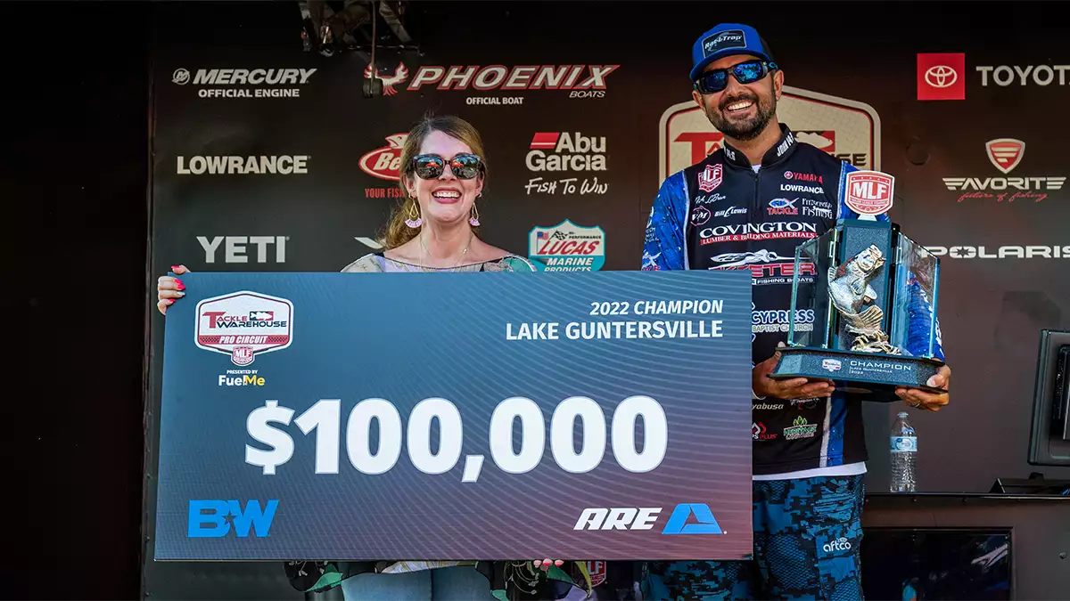After going the first three hours of Championship Sunday without a single keeper fish, pro Nick LeBrun of Bossier City, Louisiana , finally reeled in his first fish of the day – a 7-pound Guntersville largemouth – to shake things up at the B&W Trailer Hitches Stop 4 on Lake Guntersville Presented by A.R.E. in Guntersville, Alabama. LeBrun then went on a 45-minute flurry to put together a solid limit, ending the day with 22 pounds, 15 ounces to take home his first MLF Tackle Warehouse Pro Circuit win and earn the top payout of $100,000.