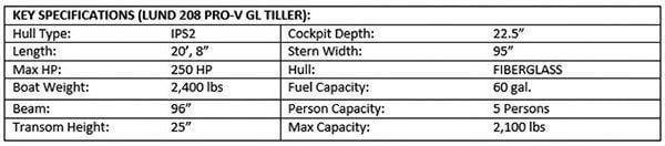 Lund Boats introduced the new 208 Pro-V GL fiberglass tiller driven fishing boat for 2014. The boat features the largest platform and available horsepower rating of its kind in the industry.