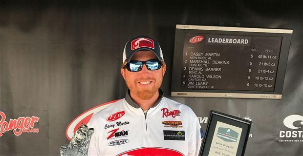 Former FLW Tour champion Casey Martin had the day of days in the first BFL tournament of the 2017 season for the Bama Division on Lake Guntersville. Martin caught a 5-bass limit weighing 40 pounds, 11 ounces, beating second place by 19 pounds, 6 ounces.