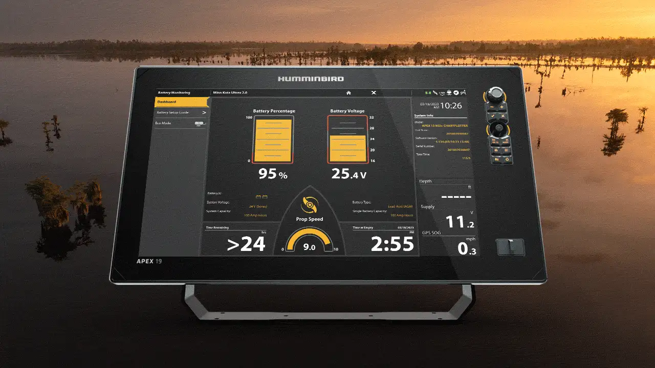 - Real-Time Battery Monitoring System lets anglers know time until empty at a given speed setting and prompts users to enter a power saving eco mode when batteries reach 20% charge