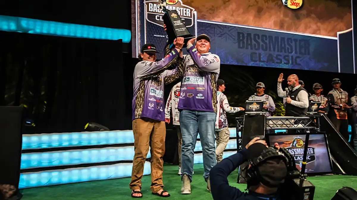 The dramatic ending took place at Tulsa’s BOK Center prior to the final day of the Bass Pro Shops Bassmaster Classic presented by Jockey Outdoors. The thousands of fishing faithful inside the arena sent up a roar of cheers for Cory and Sledge, who thanked the throngs for sharing the experience with them.