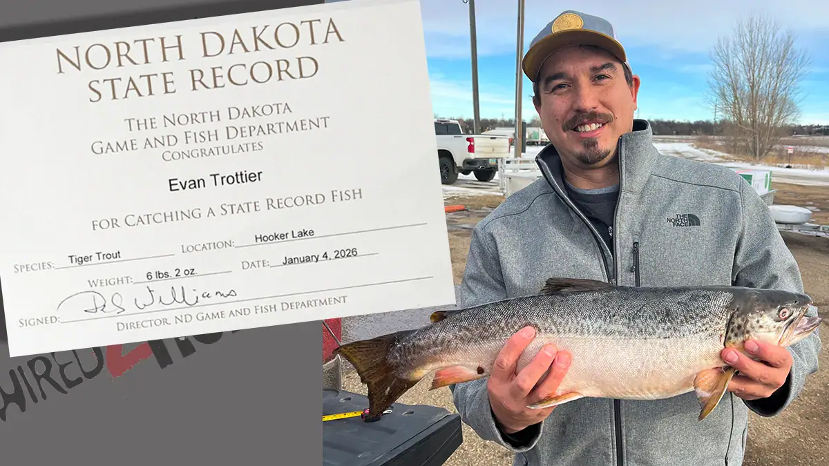 “It was about 10 a.m., and a dozen or so other folks were ice fishing around the lake, too,” said Trottier, a 40-year-old concrete project manager living in Minot, N.D. “The ice was a couple feet thick, and I was jigging a silver ‘Little Cleo’ spoon with a live 2.5-inch shiner minnow on one of its treble hooks.”