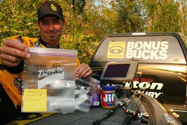 But what about when she’s not there; when she simply can’t be at a tournament? Well, the dock-skipping Quantum pro makes his own P.B. & J. But Lulu is still very much a part of the daily bread. She writes different messages of inspiration on numerous sandwich bags and sends them from their Alabama home to wherever the Bassmaster Elite Series may be.
