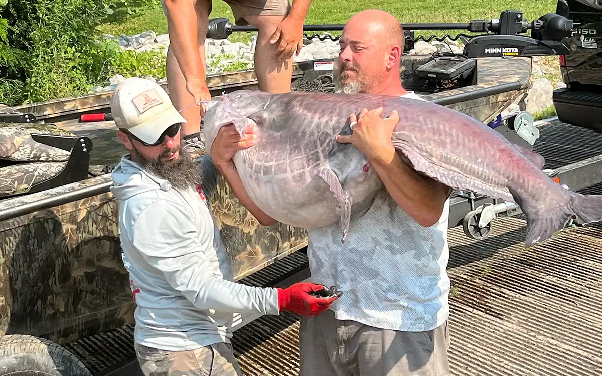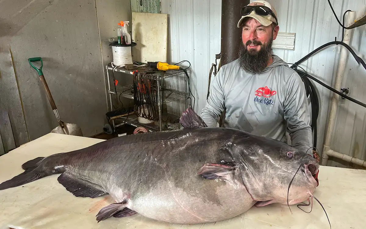 Current Tennessee state record holder, Micka Burkhart, caught another monster blue catfish noon on June 28, 2023 on the Cumberland River in Stewart County on a white bass head and 40-pound test line. The 122.3 pound blue cat will be a new Tennessee record pending verification and certification.