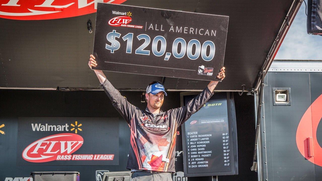 BUCHANAN, Tenn. (June 20, 2015) – Curtis Richardson of Belleville, Ontario, Canada, brought a 19-pound, 9-ounce five-bass limit to the scale Saturday to win the Walmart BFL All-American on Kentucky Lake and the $120,000 payday. Richardson’s three-day cumulative weight of 15 bass totaling 66-5 gave him a 3-pound, 6-ounce edge over second-place angler Jeremy Lawyer of Sarcoxie, Missouri, in the nationally-televised event which hosted the nation’s top weekend anglers.