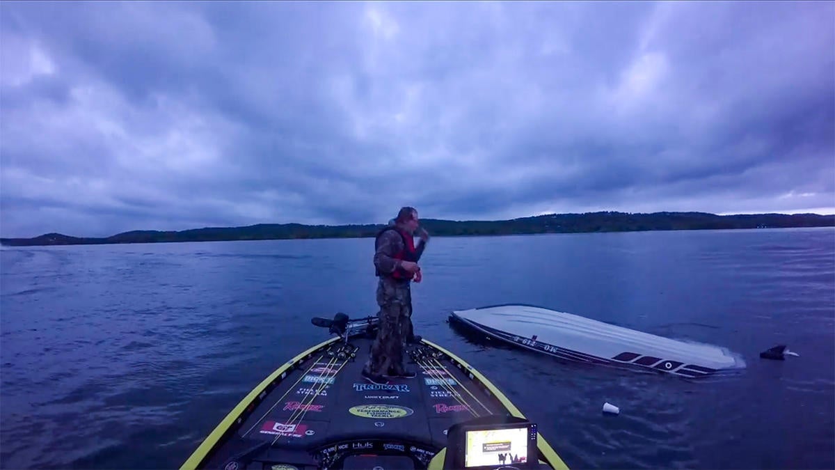 Skeet Reese was fishing the Major League Fishing Bass Pro Tour on Table Rock Lake this past weekend and not only witnessed but was also able to provide aid in a wild single boat wreck that he captured on video. You can see in the video that the boat hooks and the angler is catapulted into the water. Reese and his marshall race over to the angler and get him in the boat just as the boat, that is half in the water on its side, flips completely upside down.