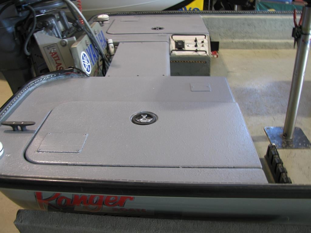 Just about the time that we thought we had completed the work on our Ranger Banshee we found a killer new product from Ultra Tuff that puts a tough rubberized coating on fiberglass. Using a polyurethane water soluble product with rubber particals makes a non-skid coating that is light weight and looks great. A special roller is needed.