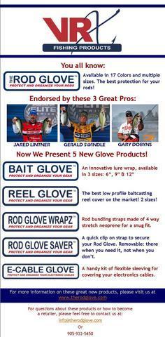 VRX Fishing has increased their product line with 5 new product lines for 2011/2012. You know about the Rod Glove and all of the benefits it provides but now they have 5 other families including Bait Glove, Reel Glove, Rod Glove WrapZ, Rod Glove Saver and E-Cable Glove. Each are designed to protect valuable equipment and make it more manageable.
