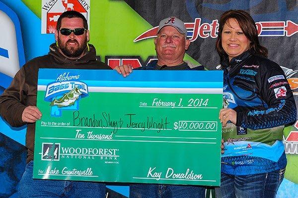 Jerry Wright of Waterloo, Ala. and Brandon Staggs of Summertown, Tenn. won the Alabama Bass Trail’s inaugural event on Lake Guntersville with 5 bass weighing 32.02 pounds. The duo won $10,000 for besting a full field of 200 boats and 400 team anglers on a cold morning in North Alabama.