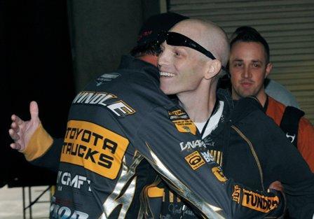Kevin and his friends went over to Swindle’s boat. This was their private time together, brothers held together by two common threads, firefighting and their love of Kevin. Kevin VanDam stopped by with them and they spent 30 minutes or so together, G, KVD, Kevin and his buddies. As they drove towards the weigh-in we scurried to get inside to watch what was about to happen. The moment when he drove through the curtains onto the stage time stood still. His smile was from ear to ear and there was not a dry eye in the place. Photographers like Dan O’Sullivan and Alan McGuckin told me they just pointed and shot because they couldn’t look through their viewfinders because of tears. It was a surreal moment I will never forget.