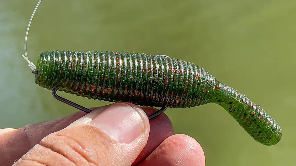 The sides have grooved channels, perfect for hiding the point of an EWG hook in it. I’ve rigged it both from the tip of the bowling pin to the other way around with the bowling pin top or what I call the tail coming out the bottom. I much prefer it rigged with the hook point coming out of the big end and the small end acting as a tail as you fish it. A lot more action and a lot better hookups.