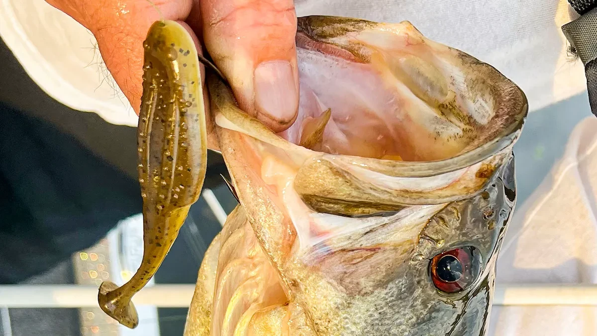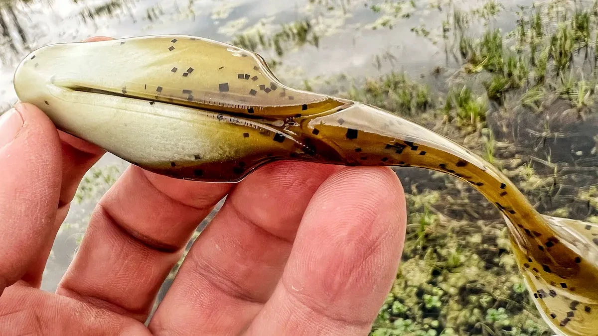 This slit in the body creates a cavity for the hook to tuck up into and make the bait more weedless, while also removing some of the thickness of the bait to make for better hook penetration. And the dual slits at the start of the tail section allow the bait to kick a little harder.
