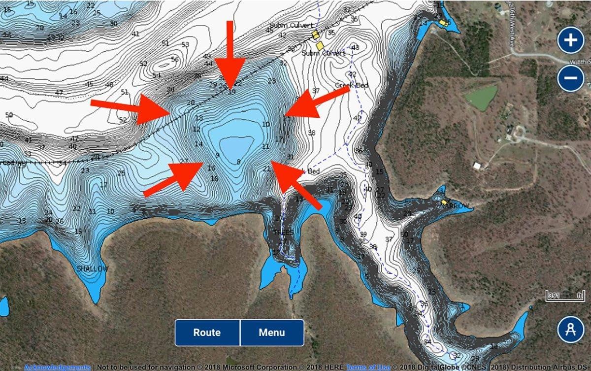 The first step to finding offshore sweet spots is putting in some research off the water. When May rolls around each year, I study as many contour maps or depth charts of a fishery as I can find. Resources like Fishidy, Navionics, Google Earth and old-school paper maps are essential tools when looking for areas off the bank. I find myself predominately using The Navionics WebApp, as you can study a detailed contour map at home on your computer and then pull up the same map on your phone while on the water.