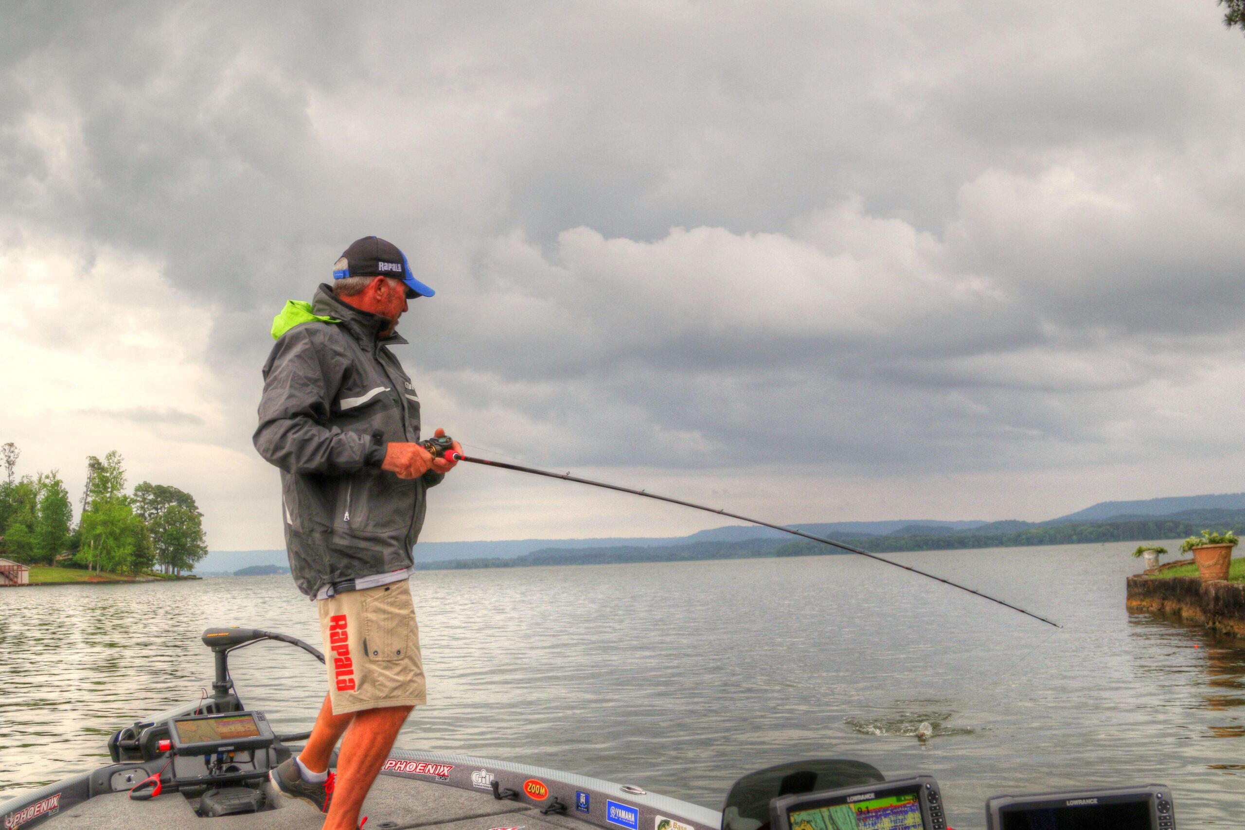 While shooting on Lake Guntersville recently, the steady accumulation of darkening rain clouds steered Tharp to the point of a residential shoreline where he knew the impending weather would find opportunistic bass capitalizing on the wave-tossed baitfish.