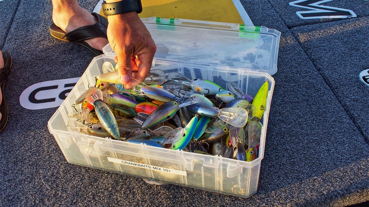 Whether he’s caught a few fish from a school and fired them up, or his electronics shows the bass are extremely active Lee will employ a plethora of different deep-diving crankbaits. He begins rotating through different plugs based on their diving depth, color, size and sound they emit.