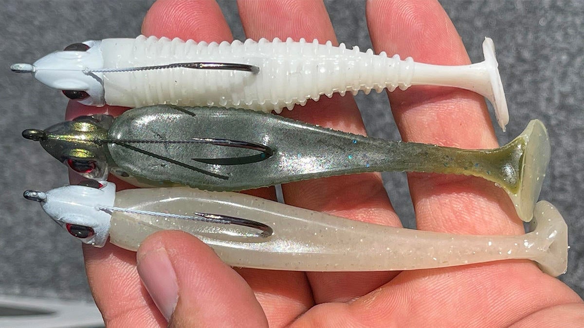 As you can see, I was able to rig several of my favorite small swimbaits perfectly on the Gem Shad Swimbait Head. Pictured here are the Tackle HD Swimmer, Jenko 4-inch Booty Shaker and Scottsboro Tackle 4-inch Swimbait.