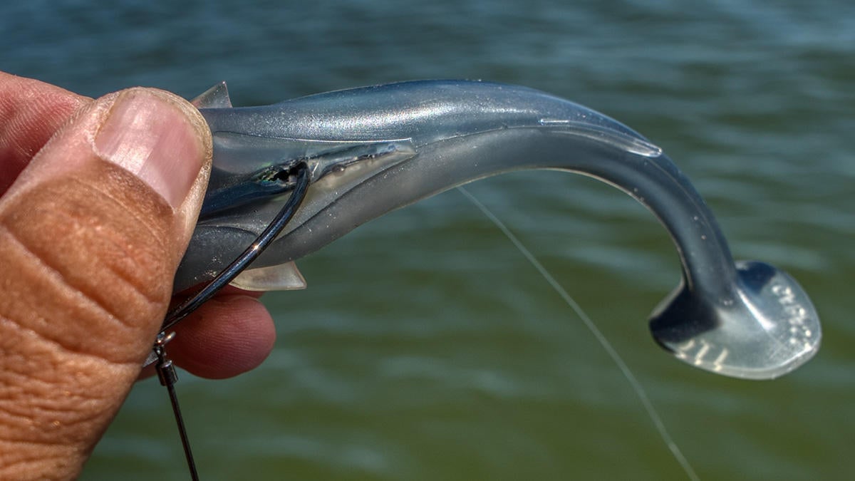 But the real allure to me is being able to rig it weedless. The formulation of this plastic is a little more dense that gives it weight, rigidity for rigging without sacrificing its action. That’s not an easy thing to get right in a soft swimbait.