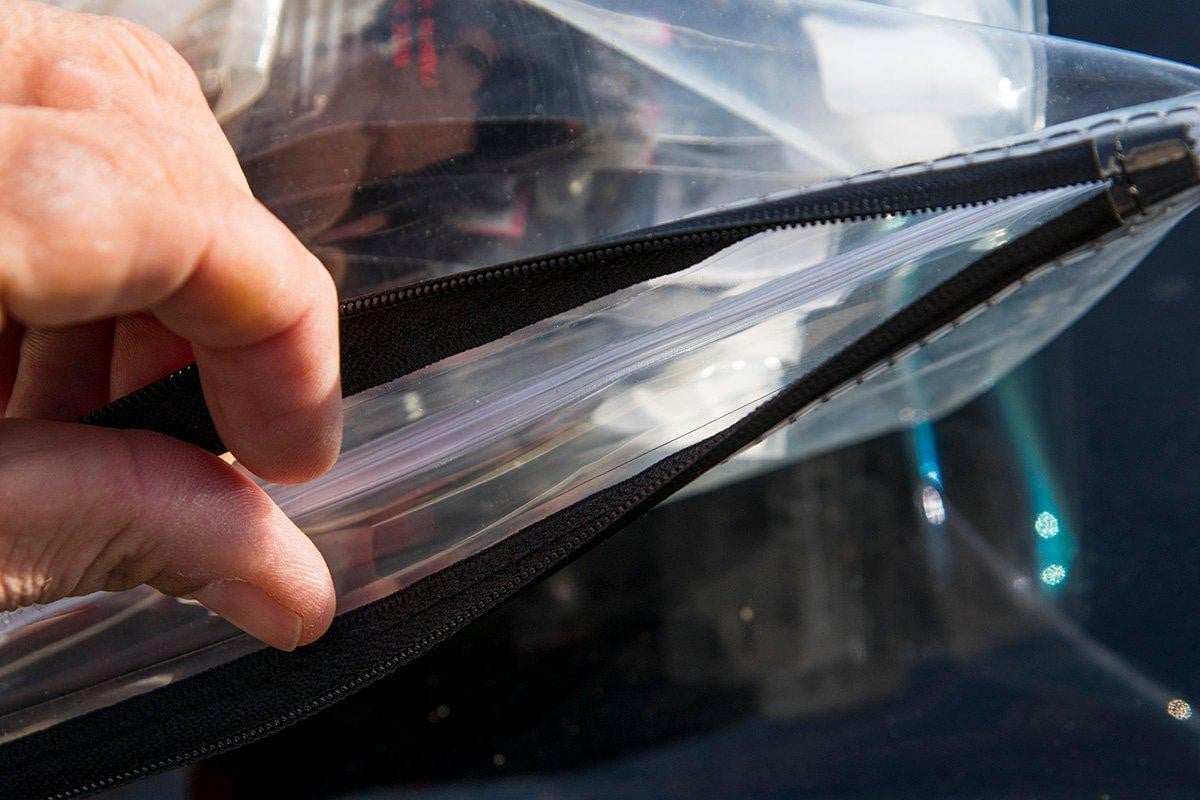 The Money Bag features heavy-duty stitching, a double sealing enclosure with a lock-tight seal on the inside and a heavy-duty zipper on the outside. The welds on the seams is solid and seems to be able to withstand stretching and even some mild poking from more rigid packaging and clam shells.