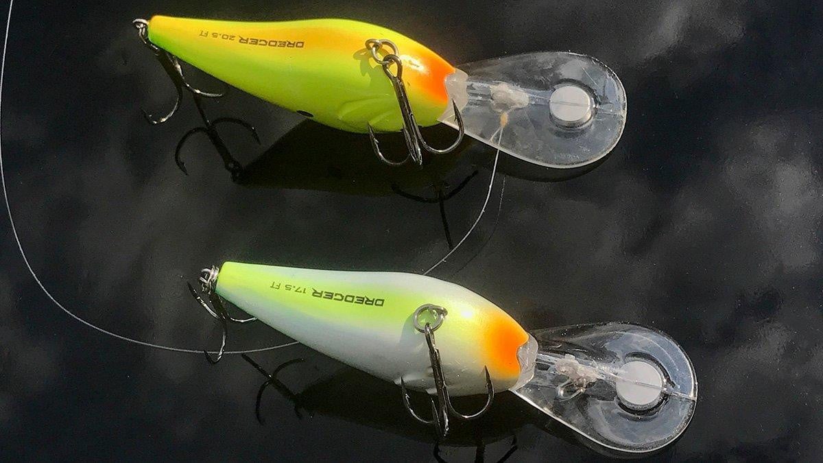The Berkley Dredger crankbaits have a good narrow profile that seems to help with their swim pattern. I caught fish on a 15-foot ledge really well earlier this year with the 17.5. And caught fish on a 20-foot ledge with the 20.5. Both were on 10-pound Seaguar InvizX fluorocarbon. The baits get down to their said depths on a very long cast with the lighter line. And they are compact compared to deep diving bass fishing crankbaits of equal depths.