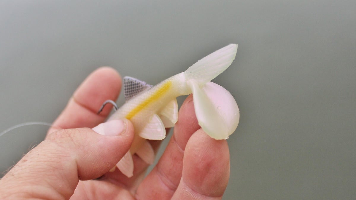 The tail design is what first caught my eye with the Sick Fish. Where most soft body swimbaits have either a boot or paddle tail, the Sick Fish has a hybrid paddle tail with a little fin shooting straight back out of it. And the paddle isn’t flat, it has sort of a scoop to it. So what you’re left with looks like someone accidentally laid a knife sharp edge down in the spoon slot of the silverware drawer.