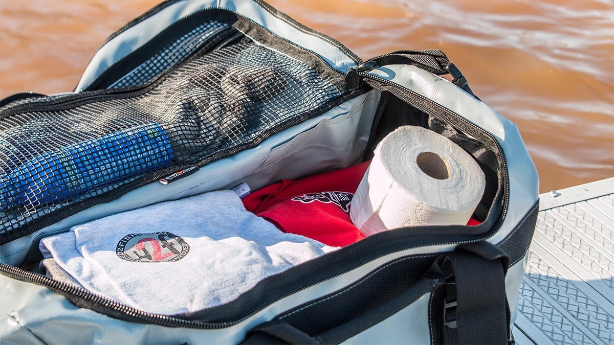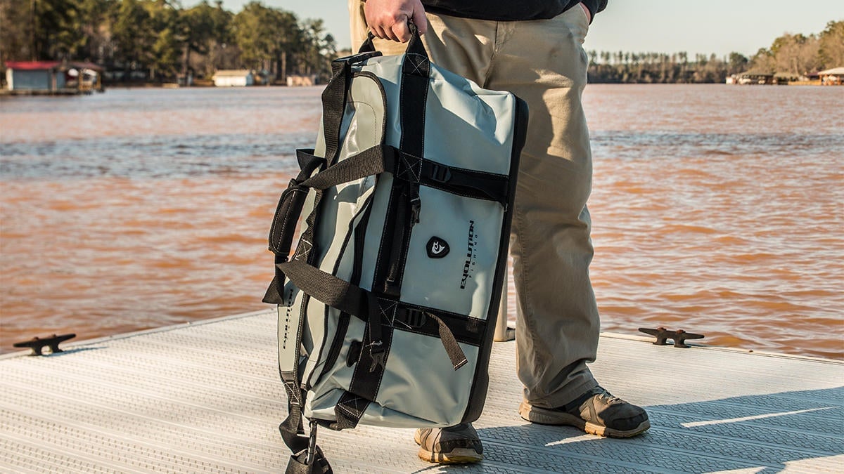With all of that being said, I have been relying on the Evolution Outdoor Tarpaulin Series Fishing Gear Bag to keep my gear dry at all times. You might be wondering why I just don’t keep my clothes in a rod locker or something. Well, the lids of a 21-year-old bass boat aren’t necessarily waterproof. I got tired of my extra clothes mildewing and my emergency toilet paper disintegrating, so I stuffed all of my essentials into this bag.