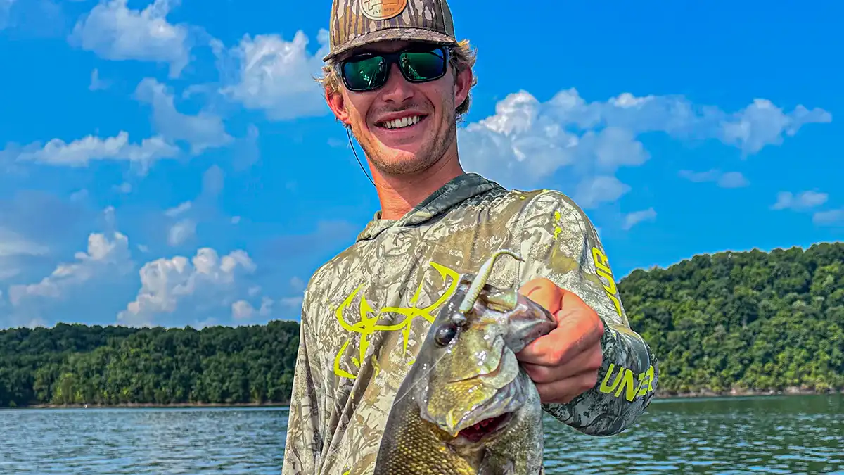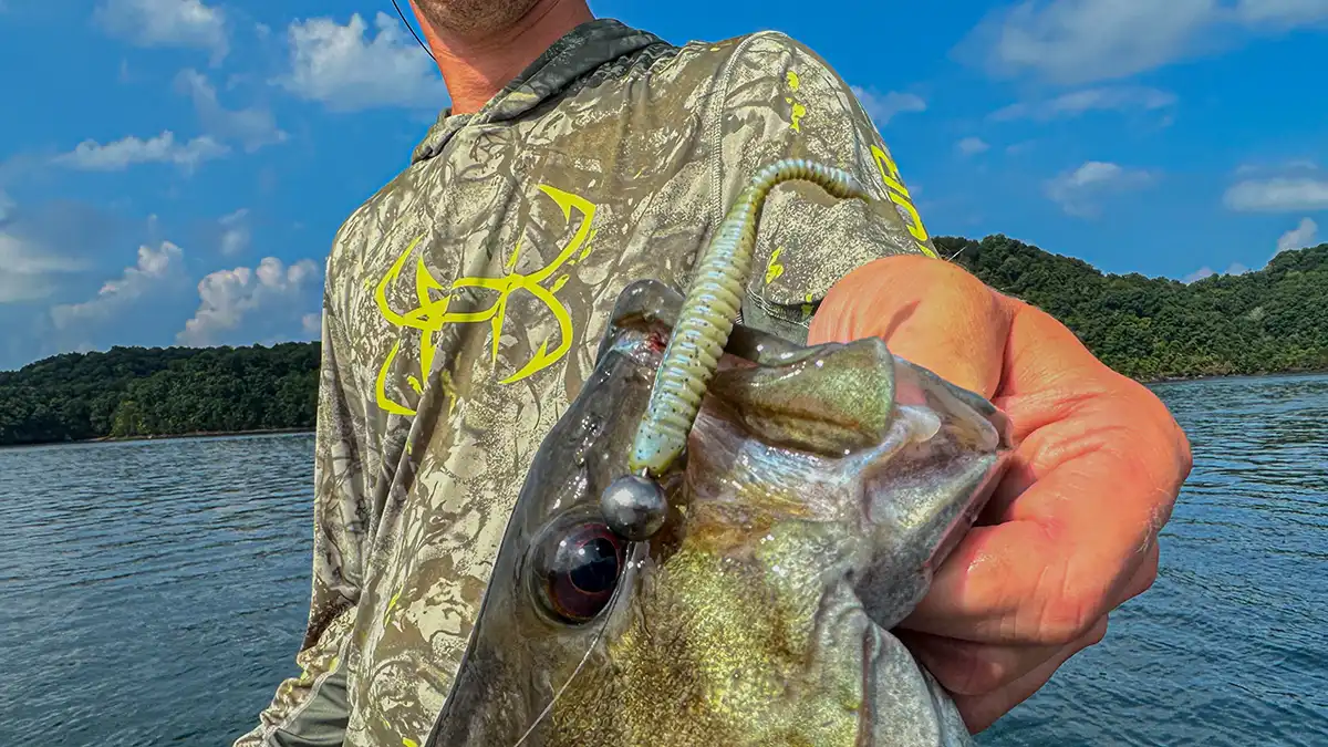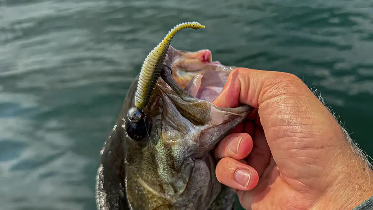 I recently returned from the Bassmaster Open on Lake St. Clair, and I caught the majority of my fish each day on the Drop Minnow rigged two different ways. I ended up placing 19th out of 225 anglers, and I caught my fish by targeting smallmouth feeding on perch. If the bass were suspended, I’d throw the 3.25-inch drop minnow rigged on 3/16-ounce jig head. I’d float the minnow over their head imparting slight twitches from the rod tip. This generated some of my biggest bites each day resulting in a 23-pound bag on day two.