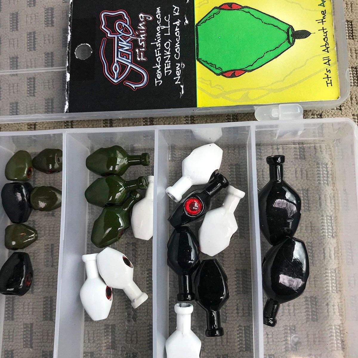 The Jenko Fishing Creature Weight comes in sizes from 3/16 ounce up to 1 ounce and in green, white or black colors. It’s not tungsten so it has a little larger profile, but I think that adds to its appeal because of the bigger eyes. I’ve been using the 3/8, 1/2 and 5/8 sizes most of the time. But I would look forward to punching the big 1 ounce weight through some grass mats somewhere.