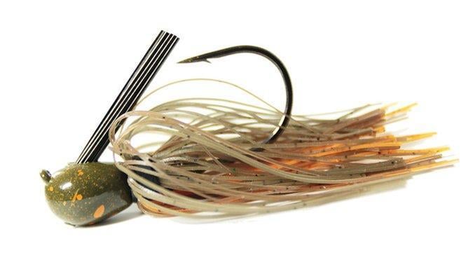 It has a rounded head with a flatter bottom section and weight on the shank of the hook for a unique fall. It comes in 6 of the most popular jig colors. It features a tapered collar that is perfect for sliding a trailer up the shank on there. With a drop of super glue, I’ve caught lots of bass on one jig and trailer combo. Not having a barb keeper keeps the jig compact and looks better with a plastic chunk hung on the hook bend as well.