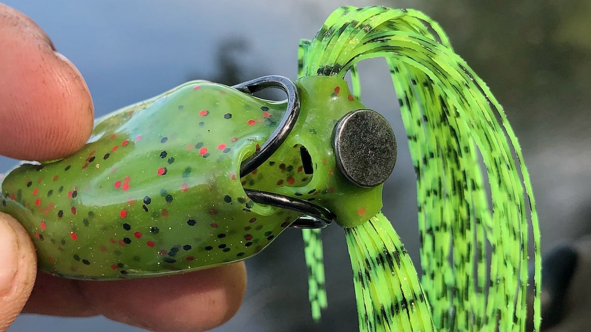 If you look at the end of the body of this bait, you’ll see a large opening and a silver weight. The weight is there to help the bait orient in the air and land belly-down each time you make a cast. But it also helps the bait create a more definitive presence when mat fishing. Adding weight to your frog is a great way to help the bait dig into the mat a little and aid the fish in locating it through the dense vegetation and scum. And having that weight secured at the tail keeps the nose of the bait up and prevents the frog from hanging up.